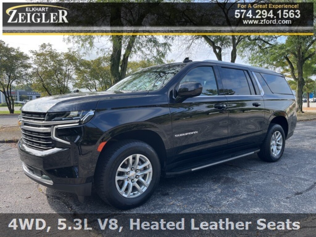 Black 2023 Chevrolet Suburban LT LEATHER, PUSH BUTTON START, REAR VIEW CAMERA, RUNNING BOARDS, HEATED SEATS, BLUETOOTH, 4X4, 10-Way Power Driver & Passenger Seat Adjusters, 1st & 2nd Row Color-Keyed Carpeted Floor Mats, Auto-Dimming Inside Rear-View Mirror, Bose 9-Speaker Stereo Audio System Feature, Bright Front & Rear Door Sill Plates, Color-Keyed Carpeting Floor Covering, Driver & Front Outboard Passenger Airbags, Enhanced Driver Information Center, Floor Console w/Storage Area, Hands-Free Rear Power Programmable Liftgate, Heated Driver & Front Passenger Seats, Infotainment Display, LED Daytime Running Lamps, Memory Settings For Driver, Navigation System, Preferred Equipment Group 1LT, Remote Start, SiriusXM Radio w/360L, Universal Home Remote, Wireless Charging, Wrapped Steering Wheel.